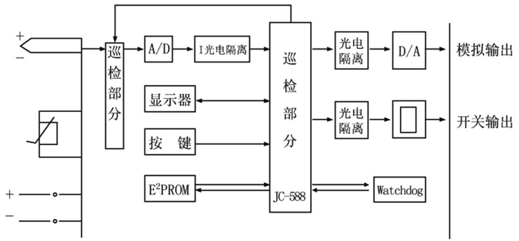 智能巡回顯示調(diào)節(jié)儀是由巡同測(cè)量同路,數(shù)字面板表、調(diào)節(jié)器和電源部分組成。穩(wěn)壓電源將220V市電轉(zhuǎn)換成穩(wěn)定的直流電壓作為其他部分電源,利用數(shù)字面板和調(diào)節(jié)器輸出控制或報(bào)警信號(hào)。
