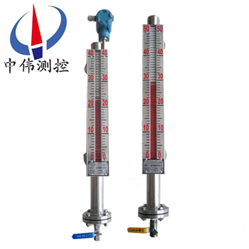 2、保溫型磁翻板液位計(jì):該液位計(jì)是在基型的主體外安裝一個(gè)保溫夾套而構(gòu)成通入蒸汽等熱媒劑。可以保持主體內(nèi)液體的正常流動(dòng)。因此適用于易凝固液體的液位測(cè)量和控制。對(duì)于低沸點(diǎn)液體可通入冷水等冷媒劑,以保證液位的穩(wěn)定。使儀表正確指示出被測(cè)液位。